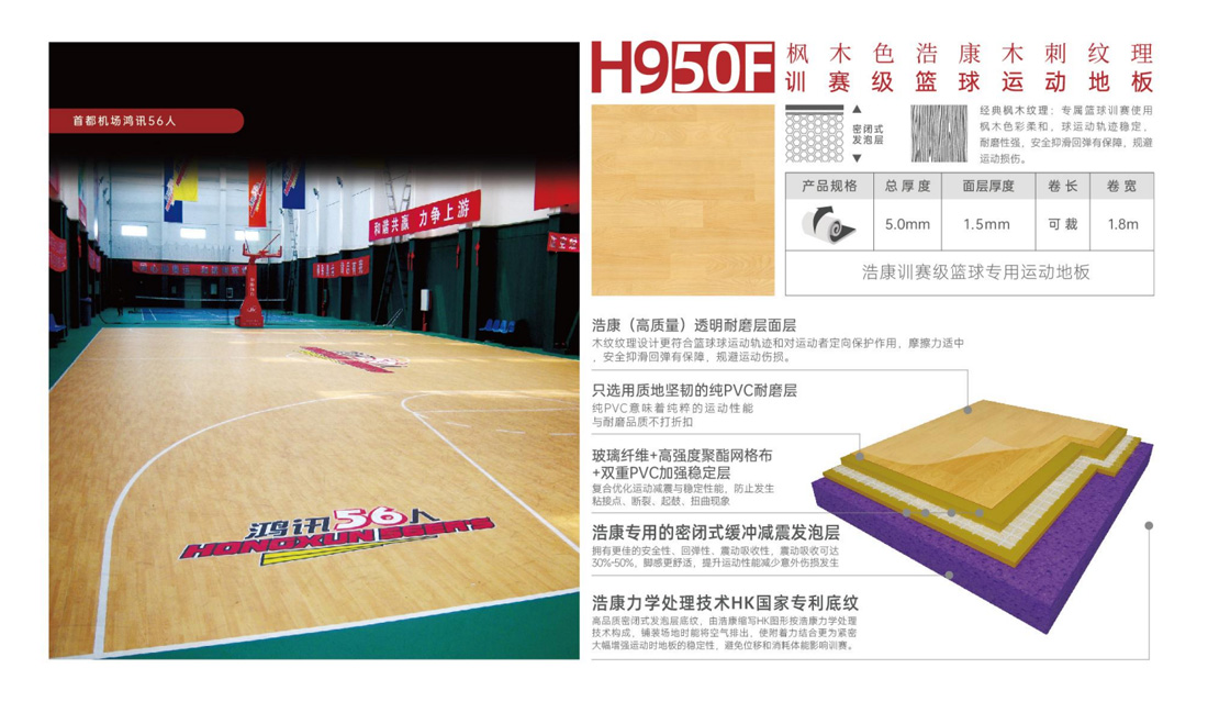 ⒊ 人性化的設(shè)計組合,與眾不同的場地色感,防滑且回應(yīng)動力極強,防擦傷紋理,全新技術(shù)開發(fā)的PVC發(fā)泡緩沖層為健康運動帶來可靠保障,為專業(yè)運動員、普通健身民眾提供極好的運動緩沖保護,可最大限度地減小運動員的損傷,令您放心地馳騁在運動賽場上屢奪佳績。