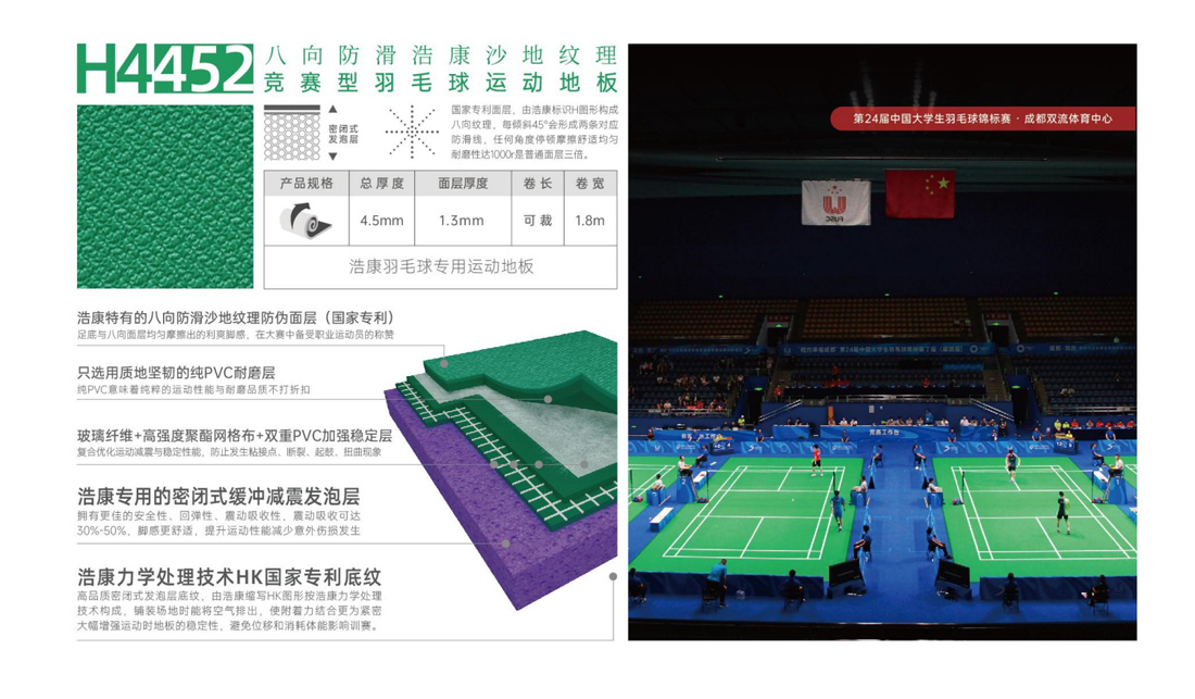 ⒊ 人性化的設(shè)計(jì)組合,與眾不同的場地色感,防滑且回應(yīng)動力極強(qiáng),防擦傷紋理,全新技術(shù)開發(fā)的PVC發(fā)泡緩沖層為健康運(yùn)動帶來可靠保障,為專業(yè)運(yùn)動員、普通健身民眾提供極好的運(yùn)動緩沖保護(hù),可最大限度地減小運(yùn)動員的損傷,令您放心地馳騁在運(yùn)動賽場上屢奪佳績。