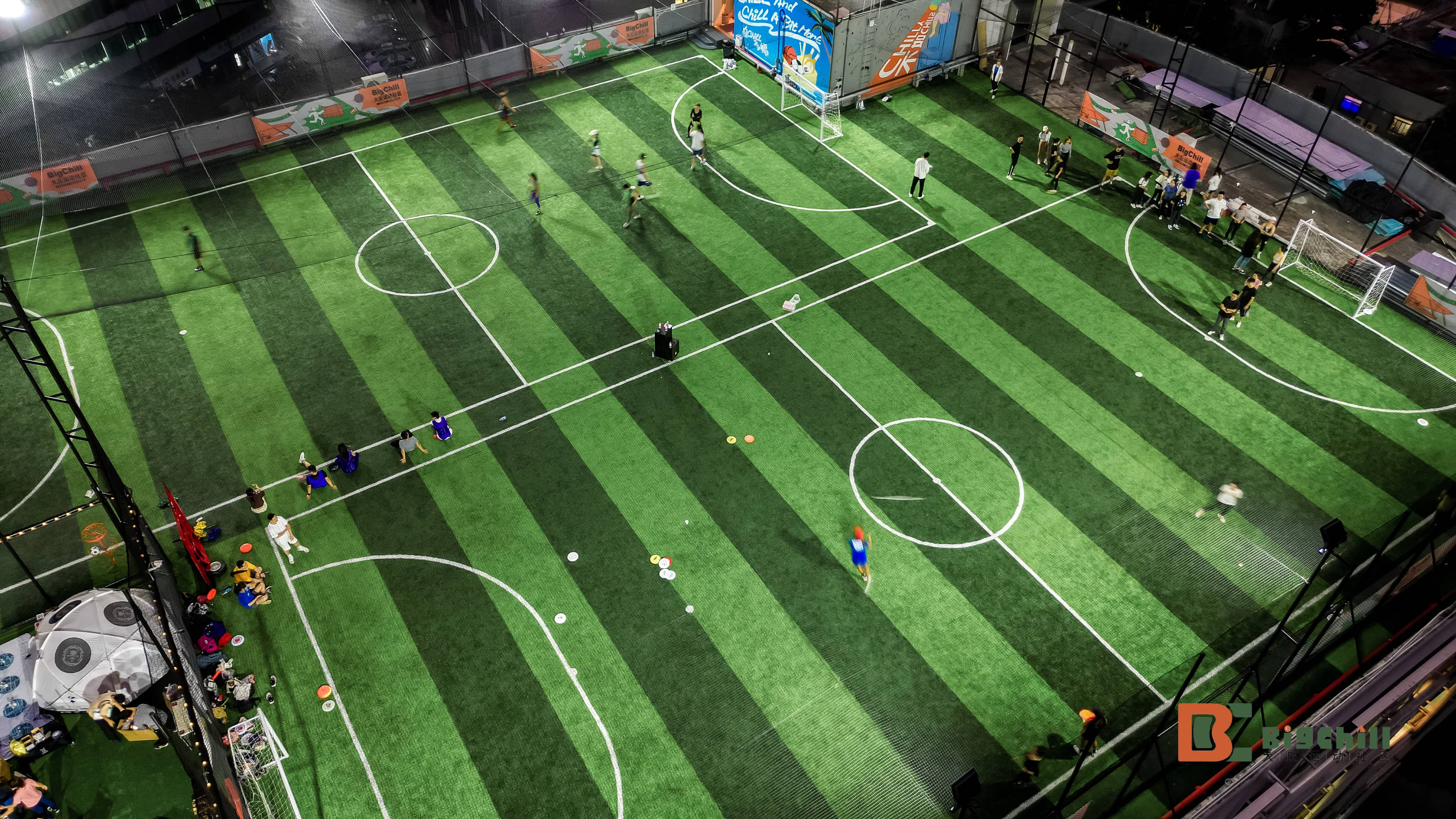7、在草皮基本拼接完畢后,再次拉線定出各功能線、點(diǎn)的準(zhǔn)確位置,以裁紙刀切開(kāi),抽出切下的草條,將連接帶放入,刮涂膠水,把原先預(yù)備好的白色草線放回,膠結(jié)后,用橡膠錘反復(fù)捶打,務(wù)求連接部分黏結(jié)緊密。